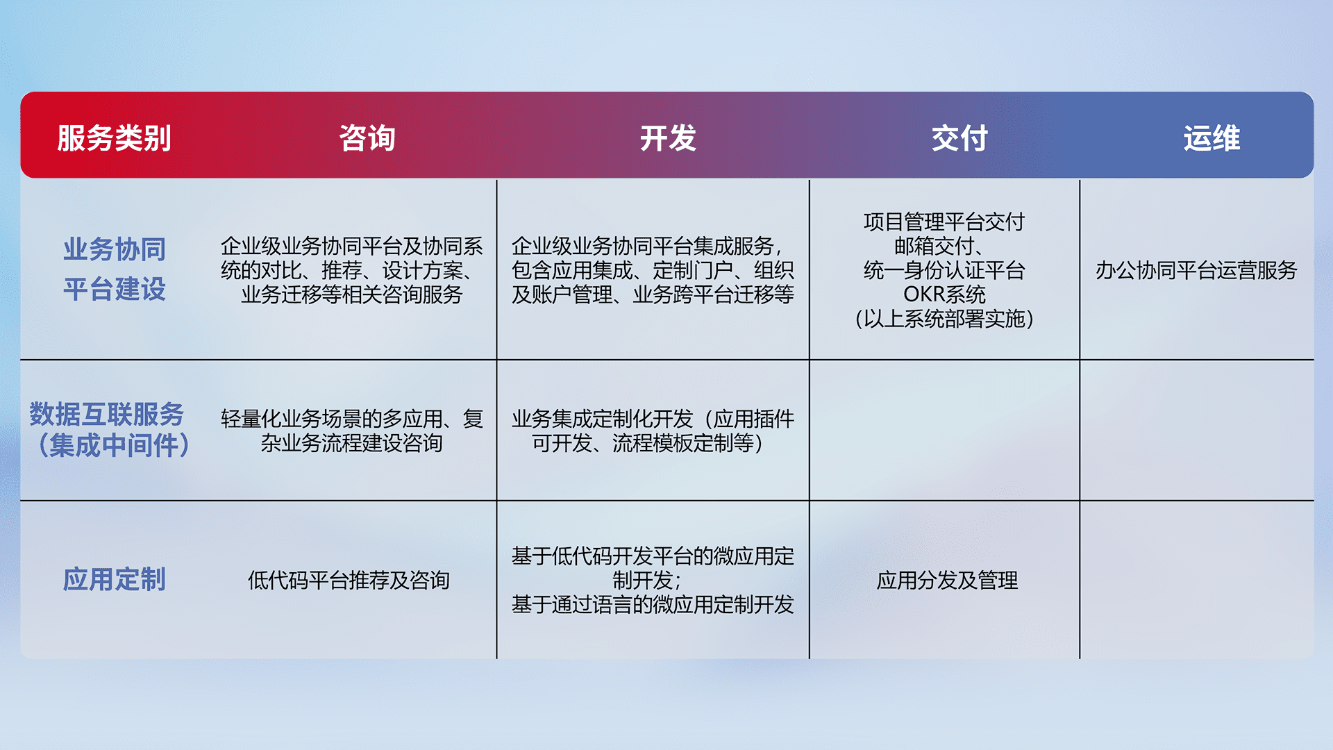 针对钉钉、、、企微、、IDaas等平台级产品提供产品的规划、、、方案、、交付、、、定制化开发等服务,,实现如统一协同办公、、、智能客户服务、、、混合会议管理、、智能数据查询、、、等业务场景,,,,实现数字化转型。。