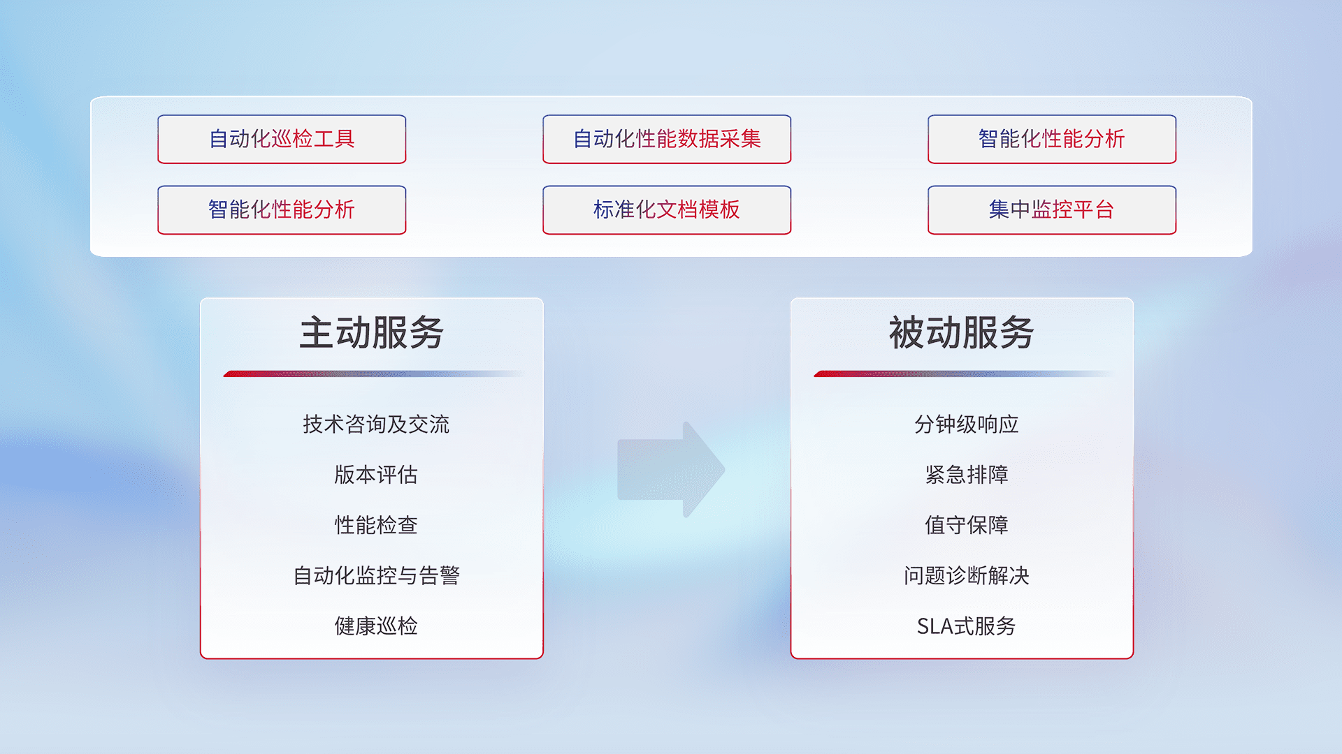 智能化工具和标准化文档,,,保障服务质量,,,提供主动服务(包含技术咨询、、、、版本评估、、性能检查、、自动化监控与告警、、健康巡检)和被动服务包含(分钟级响应、、、紧急排障、、值守保障、、、、问题诊断解决、、SLA服务)。。。。
